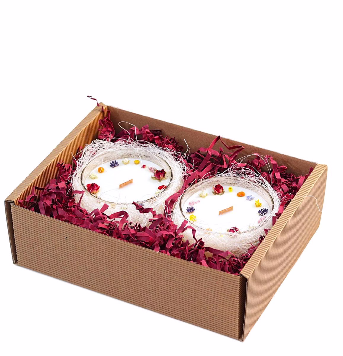 Szukasz idealnego prezentu na każdą okazję? Przedstawiamy naturalne, zdobione kwiatami zapachowe świece sojowe z drewnianym knotem o pojemności 200ml (tutaj znajdziesz te same świece indywidualnie) w dekoracyjnym opakowaniu – idealny zestaw na prezent niezależnie od okazji.