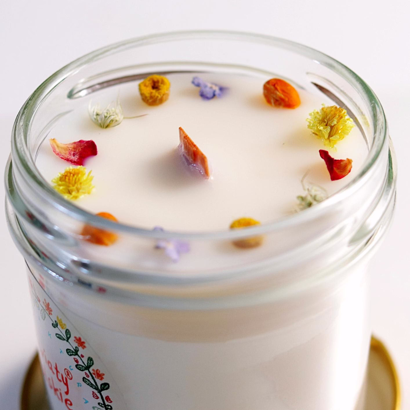 Naturalna, artystyczna świeca sojowa, stworzona dla osób wrażliwych na zapachy. Walory dekoracyjne świecy zostały zachowane w unikatowym zdobieniu kwiatowym. Drewniany knot delikatnie „skwierczy” podczas palenia, co dodatkowo wzmacnia właściwości relaksacyjne świecy.