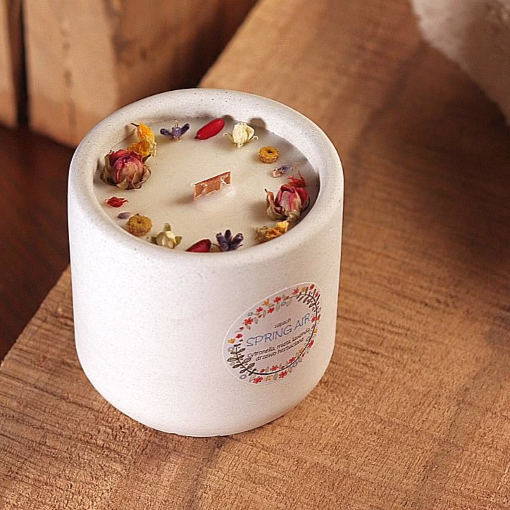 Takiego połączenia nie znajdziesz nigdzie indziej – oto nasza zapachowa sojowa świeca z drewnianym knotem w wytwarzanym przez nas własnoręcznie betonowym pojemniku i zdobiona kwiatami, o które dbamy sami od początku do końca procesu. Pozwól naturze otulić Cię i rozpieścić Twoje zmysły wciągając głęboko aromat naturalnych olejków eterycznych.